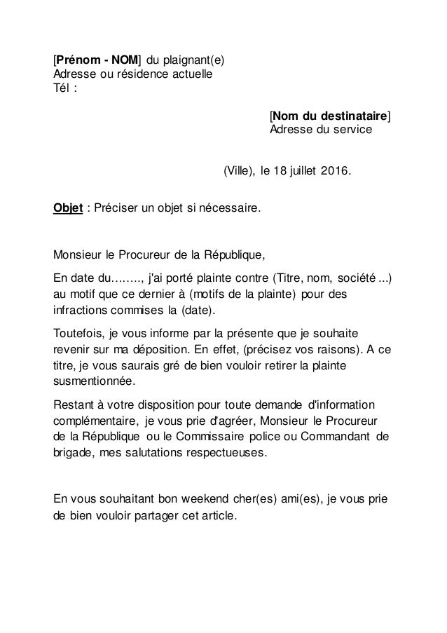 modele de lettre pour retirer une plainte au procureur exemple de lettre