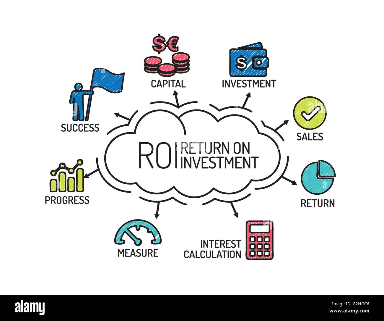 roi retour sur investissement carte avec des mots cles et des icones croquis image vectorielle stock alamy