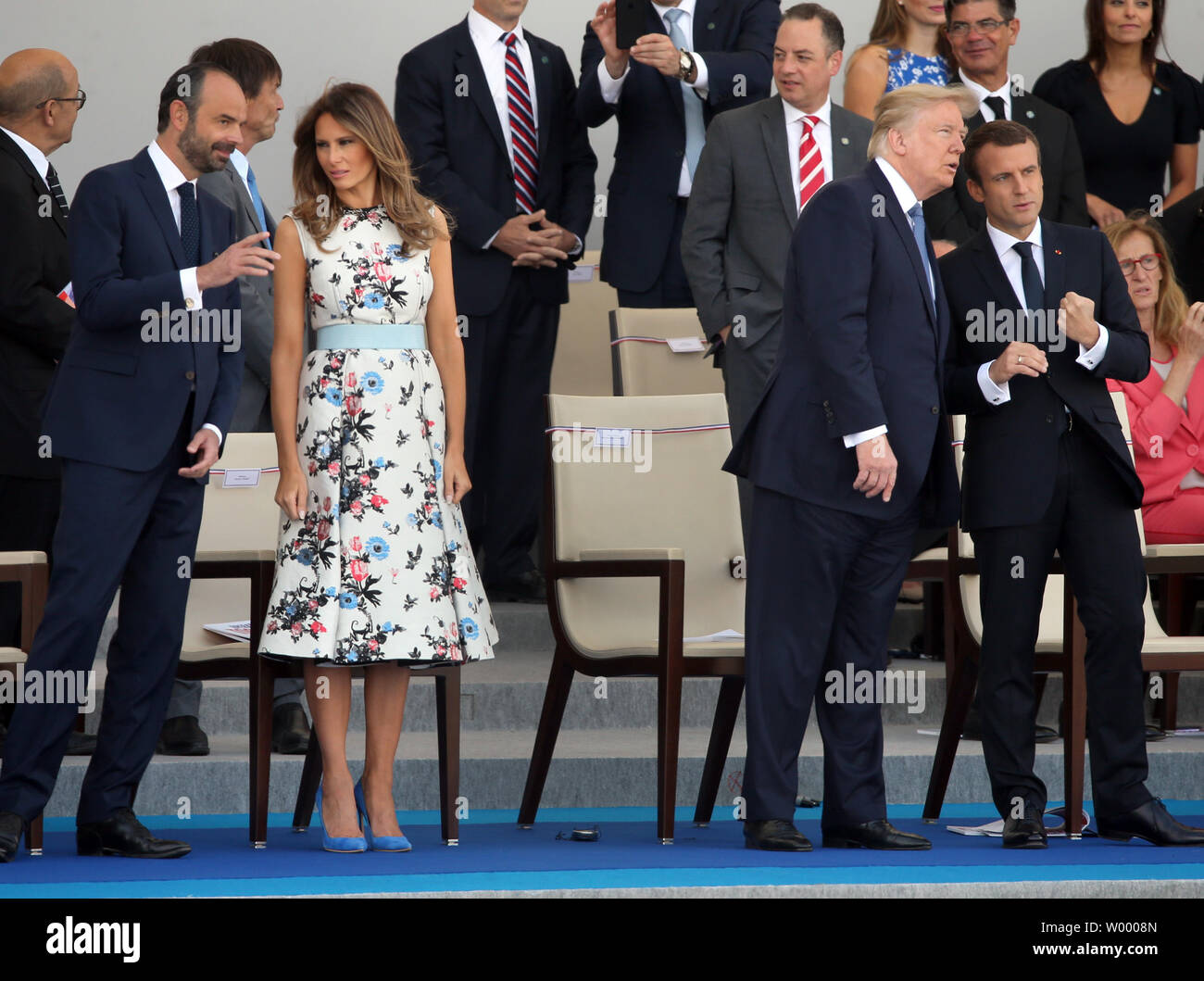 le president francais emmanuel macron r s entretient avec le president americain donald trump chat comme premier ministre francais edouard philippe l s entretient avec sa femme melania a paris le 14 juillet 2017