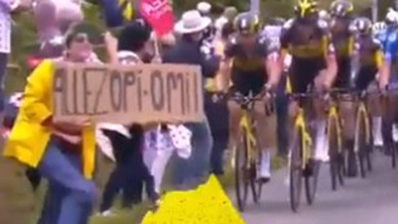 unmissable a poster of a fan caused the most unusual accident of the tour de france 2021 explica co